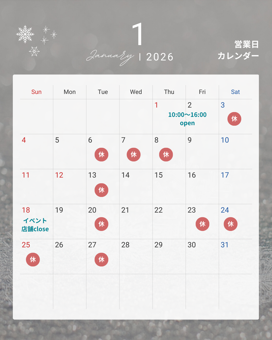 1月のお休み 3日、6日〜8日、13日、20日、23日、24日、25日、27日 18日はイベントのため、店舗はお休みです。